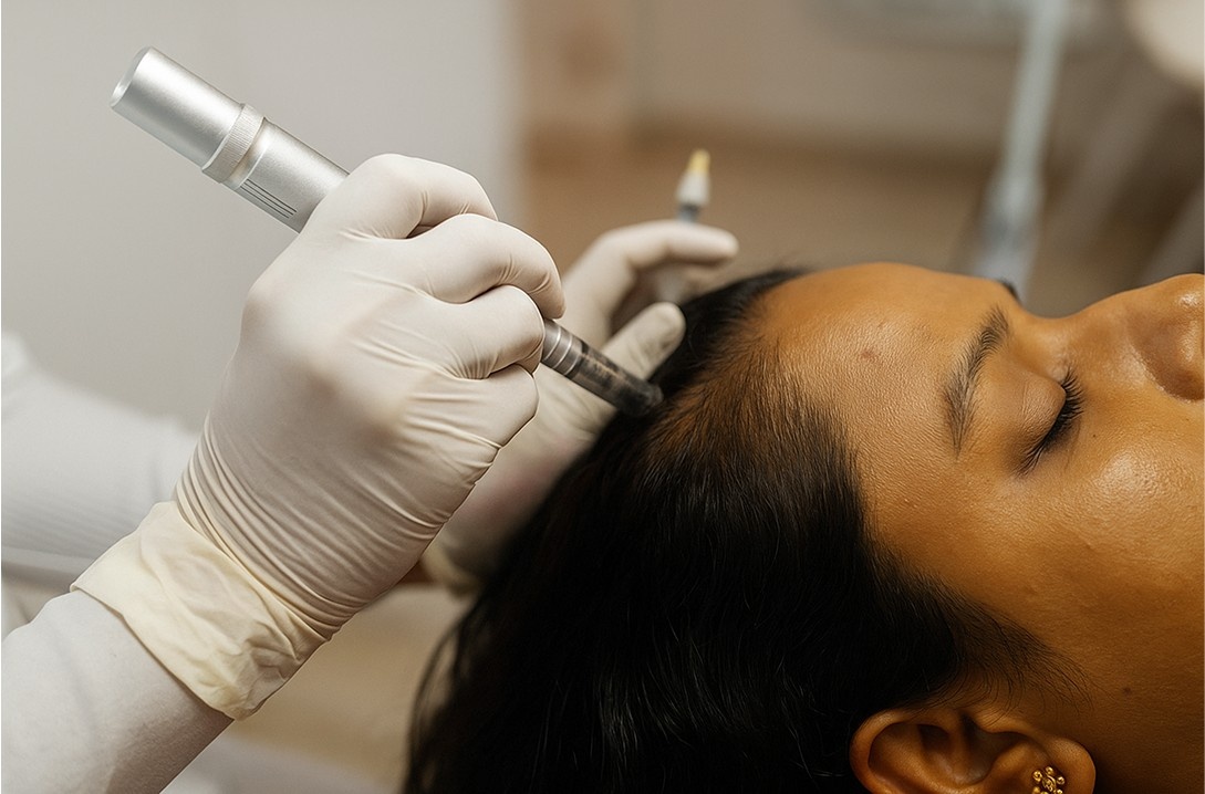 Microneedling: Controlled micro-injuries are created on the scalp to enhance absorption of PRP and GFC while stimulating natural healing and collagen production.